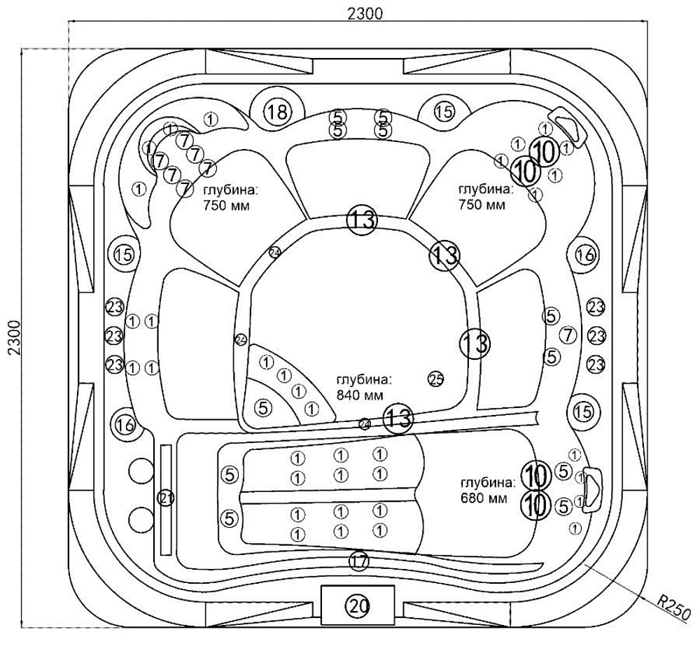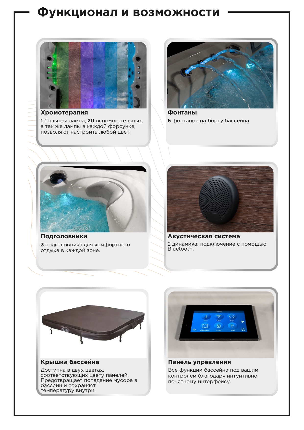 По периметру чаши расположены 6 декоративных фонтанов, которые не только украшают бассейн, но и обогащают воду кислородом. Для максимального комфорта предусмотрены три эргономичных подголовника — по одному в каждой зоне отдыха, — чтобы вы могли полностью расслабиться без напряжения в шее.
