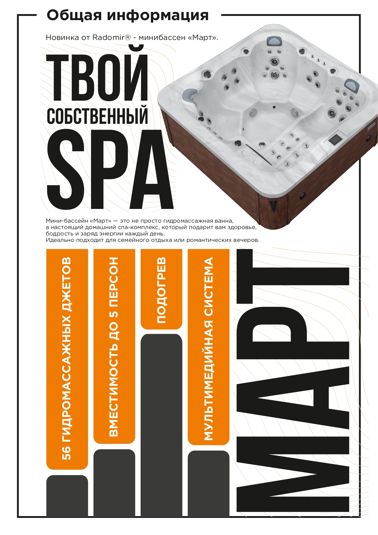 «Март» — это настоящий домашний спа-комплекс, оснащённый передовыми системами для здоровья и релакса. В основе — мощная гидромассажная система: 56 форсунок, равномерно распределённых по всему периметру чаши, и два гидронасоса по 2,2 кВт обеспечивают интенсивный, но комфортный массаж спины, шеи, ног и поясницы.