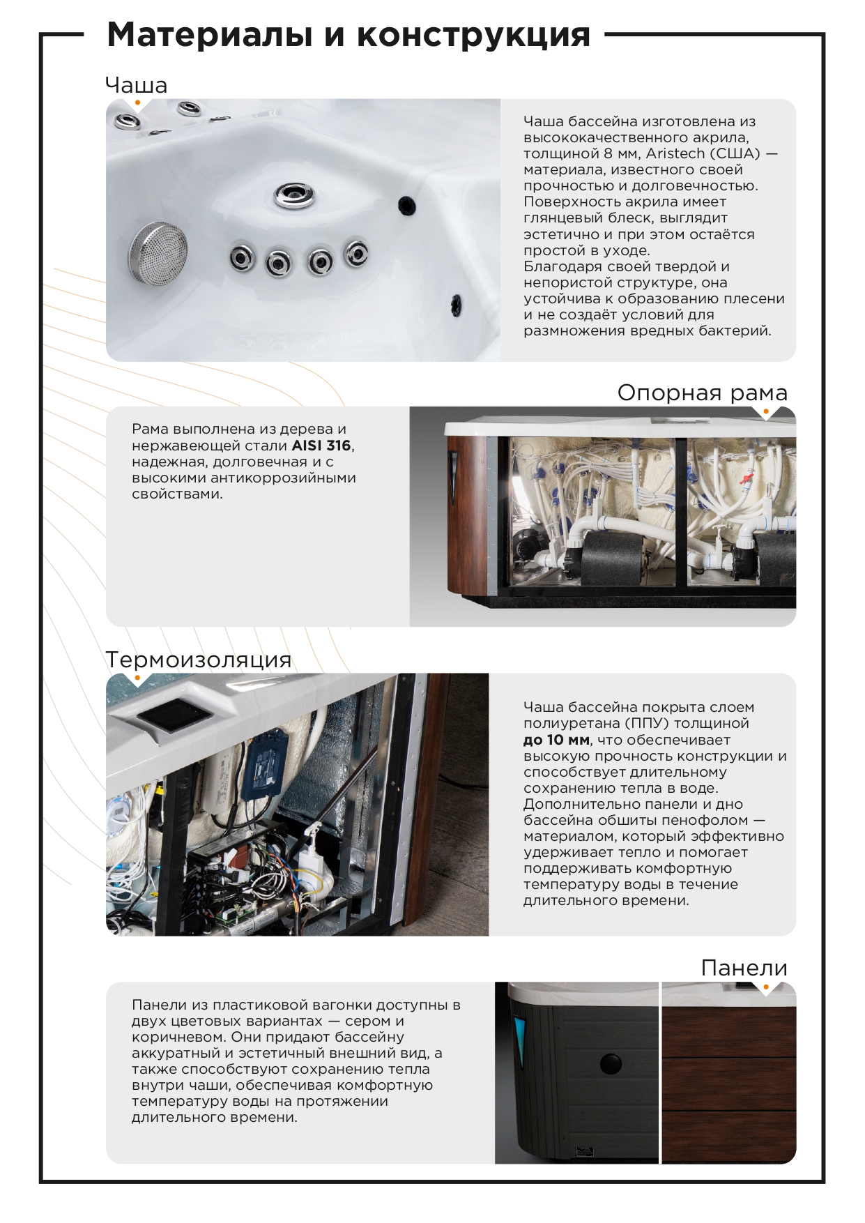 При этом конструкция продумана до мелочей: чаша из американского акрила Aristech, термоизоляция из полиуретана и пенофола, рама из нержавеющей стали AISI 316 — всё это обеспечивает не только долговечность, но и максимальную энергоэффективность. Благодаря квадратной форме бассейн органично вписывается в любое пространство — от городской квартиры до загородного дома, — создавая ощущение личного оазиса.