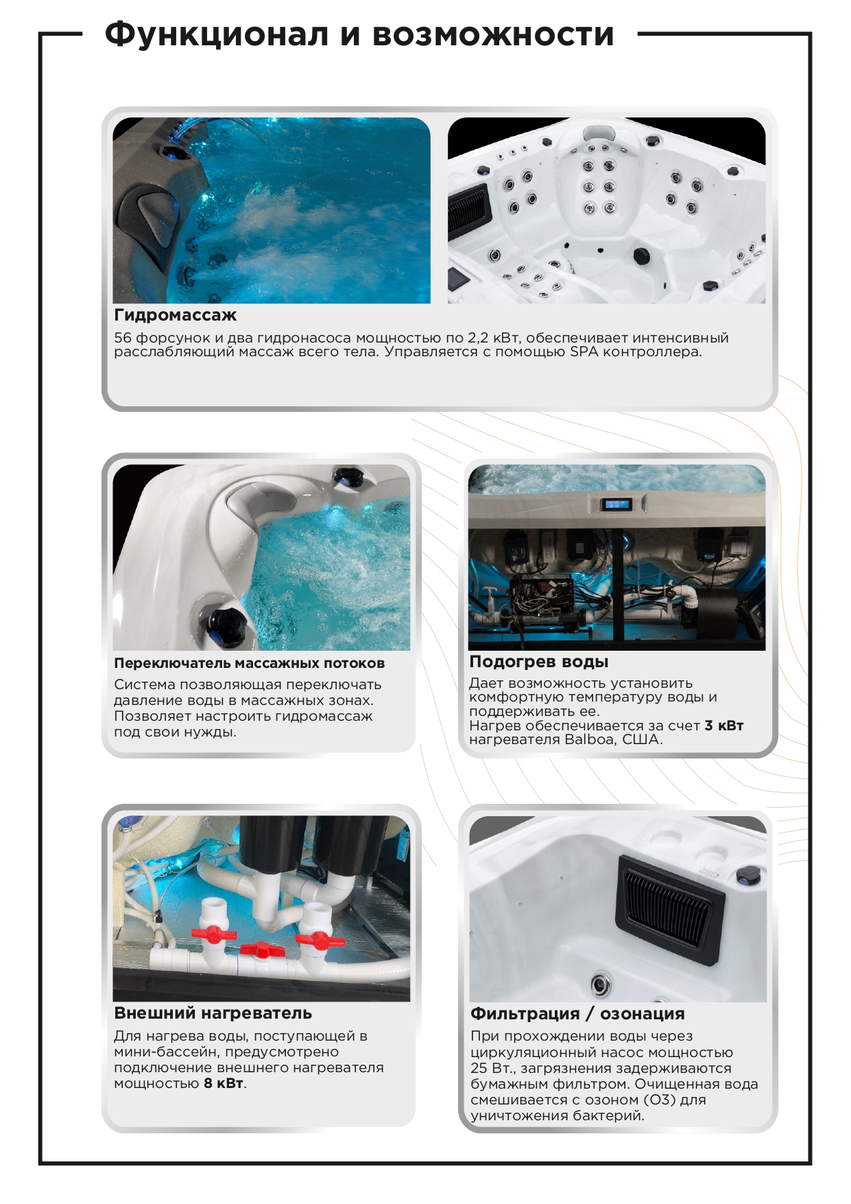 Представьте: после напряжённого дня вы погружаетесь в тёплую воду, вокруг мягко переливается свет, тело окутывают миллионы пузырьков, а мощные струи гидромассажа снимают каждое напряжение в мышцах.