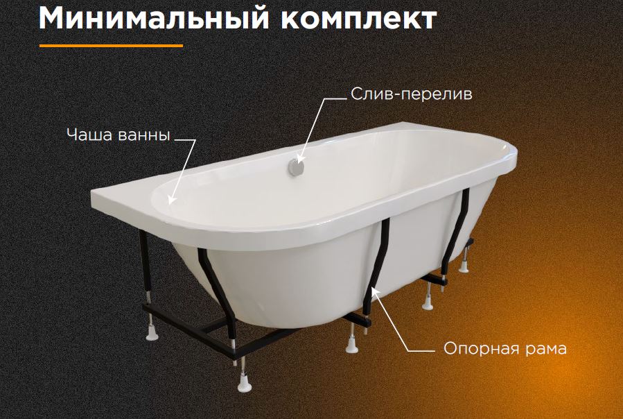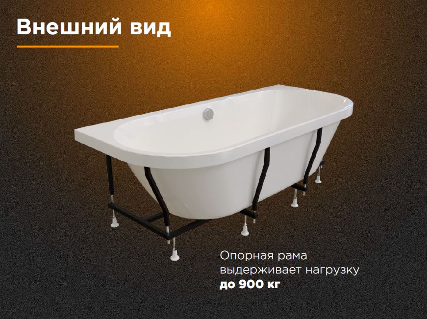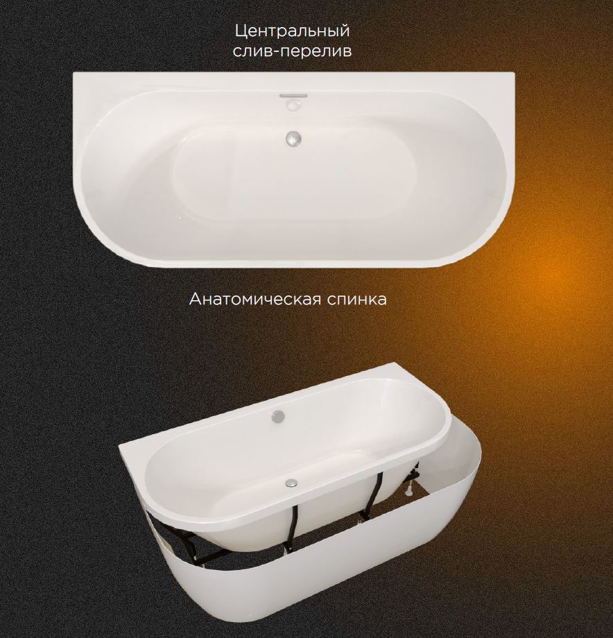 Важно, что ванна не оснащена ножками — она устанавливается на прочный металлический каркас (приобретается отдельно), который равномерно распределяет нагрузку и обеспечивает устойчивость. Также отдельно покупается слив-перелив диаметром 40 мм с отверстием 51 мм — это стандартное решение, совместимое с большинством современных систем водоотведения.