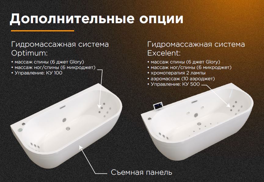 Особое внимание заслуживает уникальная возможность выбора фронтальной панели — съёмной или бесшовной монолитной, — что позволяет адаптировать ванну под любой стиль интерьера и функциональные потребности.