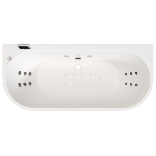 ✔ Аэромассаж — 10 аэроджетов, равномерно распределённых по периметру дна. Подача воздуха осуществляется через белые форсунки (в тон акрила), что сохраняет эстетику интерьера. Интенсивность регулируется механическим **воздушным регулятором**, расположенным на борту ванны.