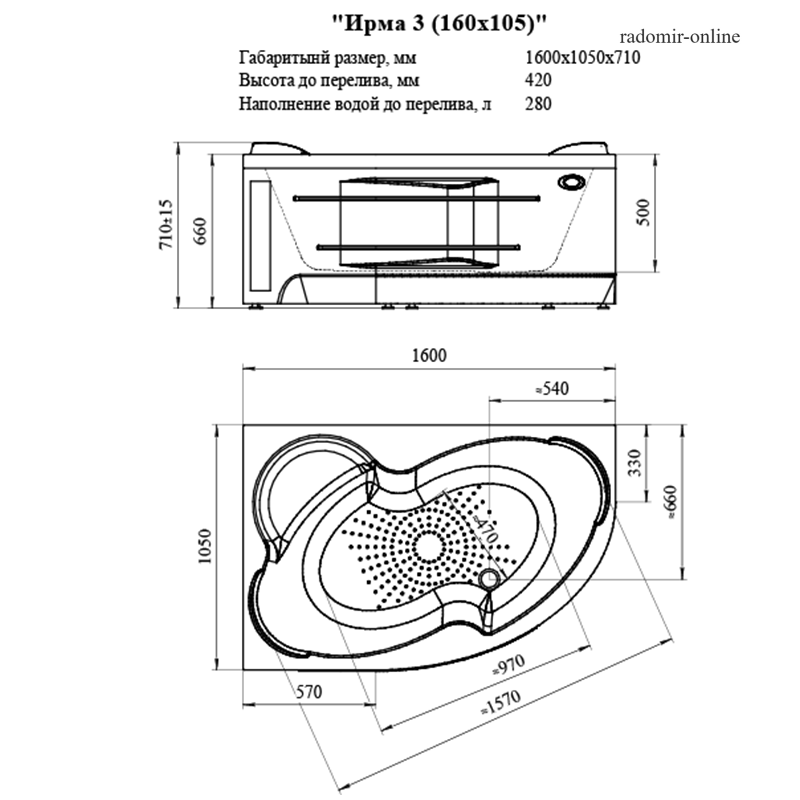 Radomir "Ирма" 160x105 левая изготовлена из 100% листа акрила толщиной 5 мм. Преимущества сантехнического акрила состоит в том, что что он быстро нагревается и длительное время сохраняет тепло воды.