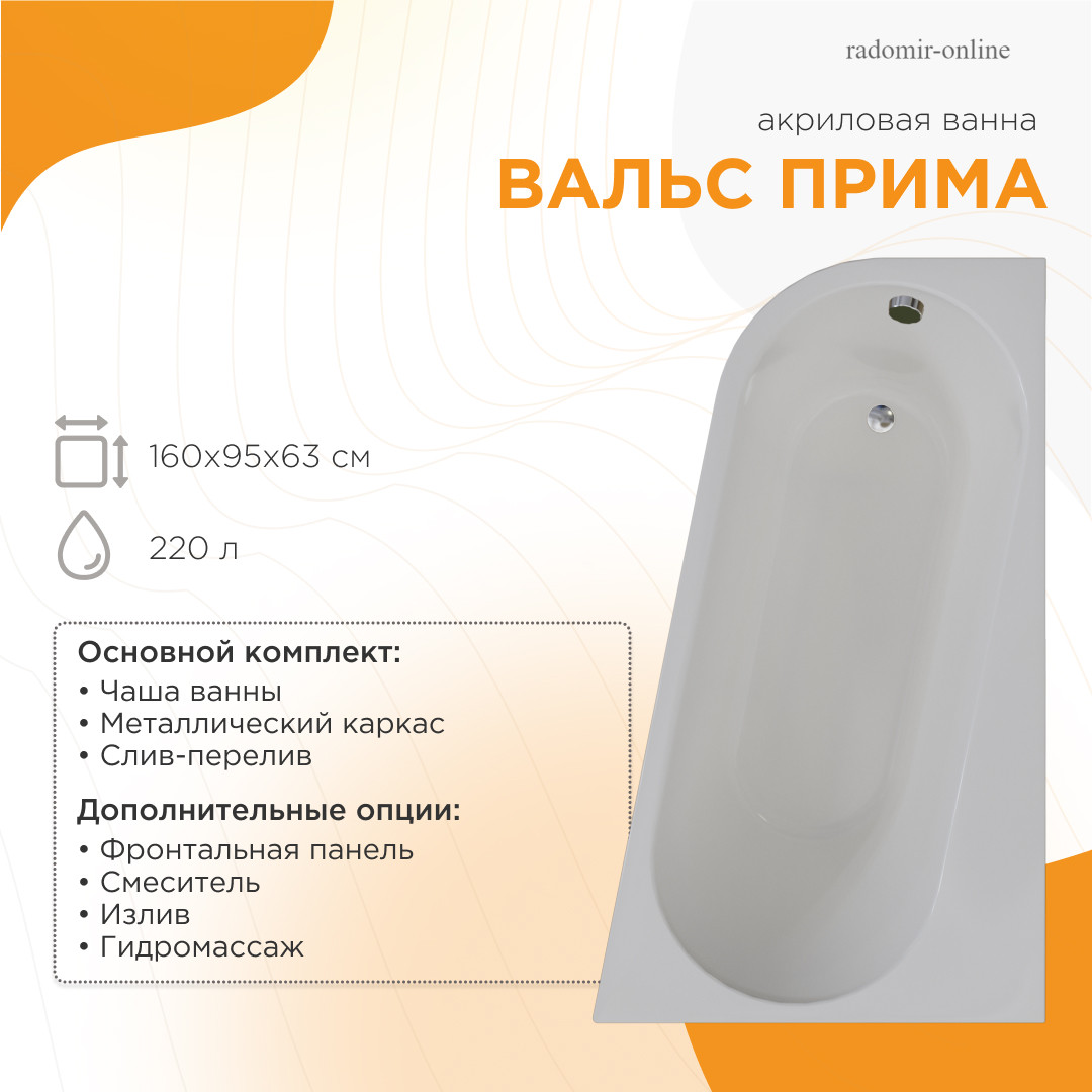 Radomir Вальс Прима 160х95 правая с каркасом – компактное и элегантное решение для обустройства современной ванной комнаты. Ее нестандартная форма придает пространству индивидуальность и стиль, при этом гармонично вписываясь даже в небольшие помещения.